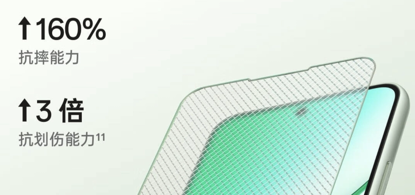 OPPO A3 率先搭载晶盾玻璃,抗摔能力提升 160%,抗划伤能力提升 3 倍。其中山涧绿配色背板使用了超耐磨晶钻工艺,大幅提升了耐磨防刮能力。