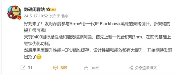 天玑9400将会首发Arm黑鹰架构,目标是性能和能效超越对手高通骁龙8 Gen4。
