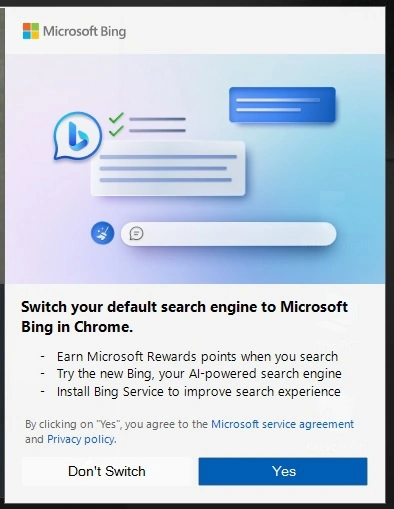 “当你搜索时就可以赚取 Microsoft Rewards 积分奖励。快来体验全新 Bing,你的 AI 驱动的搜索引擎。安装 Bing 服务以改善搜索体验。”