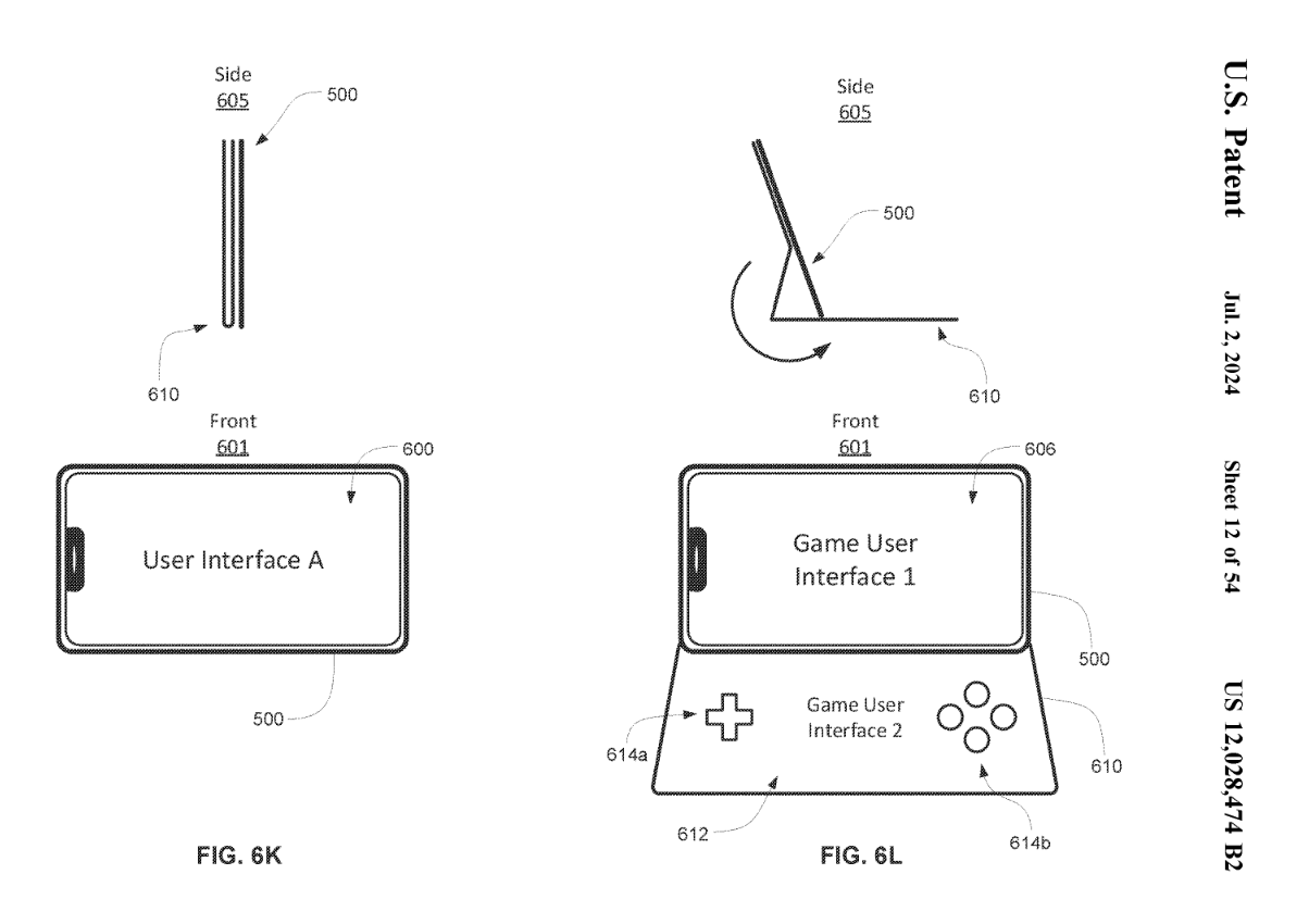 而图片 6L 和 6M 展示了另一种手柄方案,用户可以将 iPhone、iPad 插入到手柄插槽内,手柄上还提供了第二块屏幕,用于展示游戏中的各种辅助信息,例如角色状态、任务进度,以及不影响游戏的情况下和他人通话。
