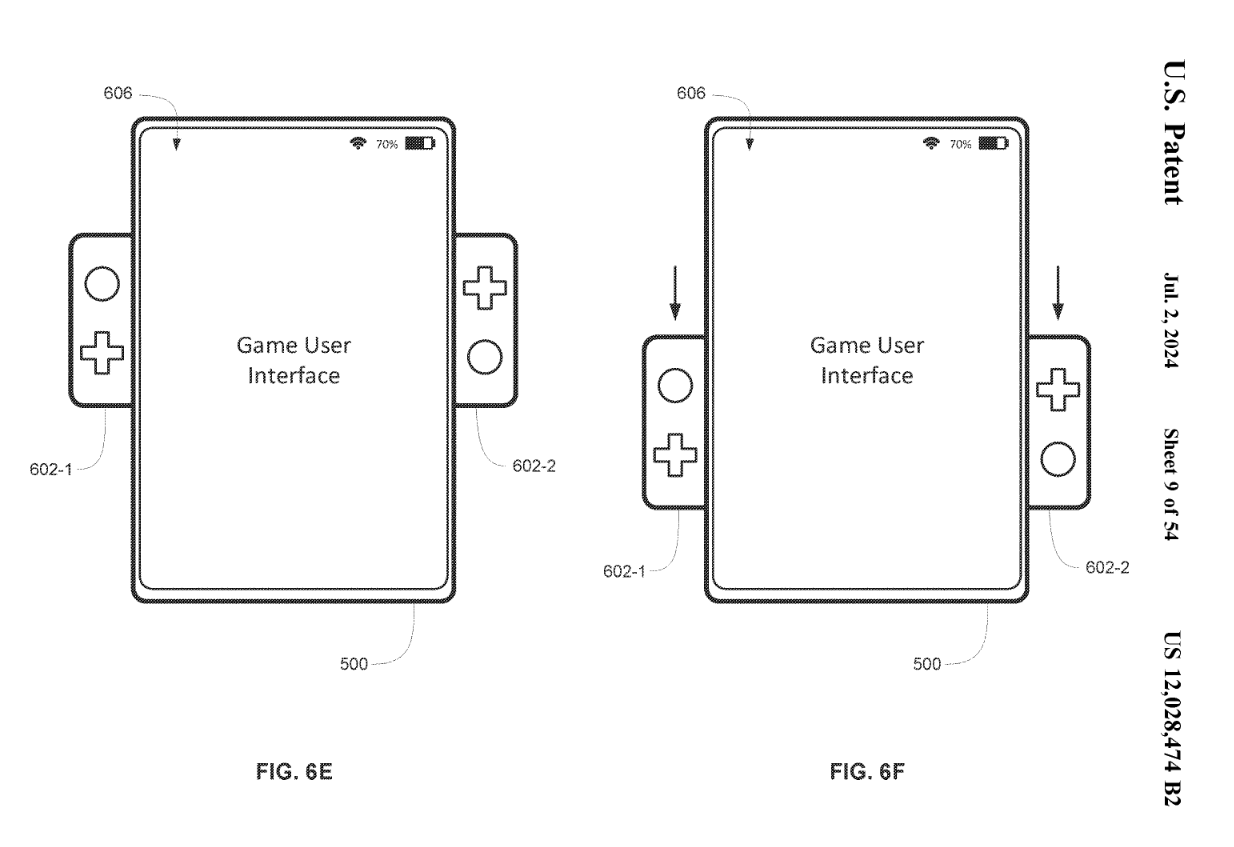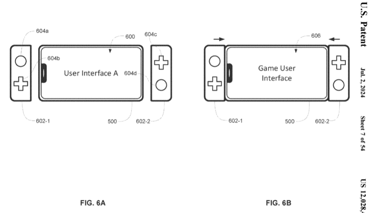 苹果公司在专利图 6A、6B、6F 和 6J 中,展示了适用于 iPhone、iPad 的游戏手柄设计,类似于任天堂 Switch 中的 Joy-Con 设计,可以附着在设备两侧进行游戏。IT之家附上相关图片如下: