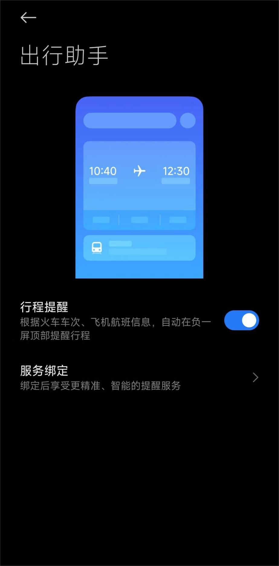 打开桌面设置-进入负一屏设置-点击出行助手-进行服务绑定(含航旅纵横、国铁吉讯账号),绑定成功后,即可在负一屏查看行程信息。