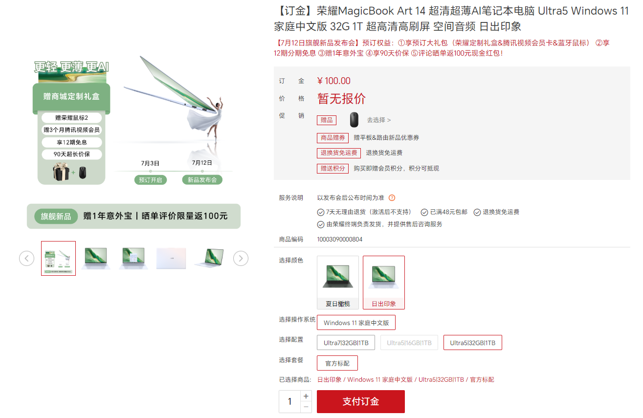其他配置方面,MagicBook Art 14 笔记本提供“夏日橄榄”和“日出印象”两种配色可选。其中,夏日橄榄整体呈深绿色,日出印象呈蓝粉渐变色。提供 Ultra7、Ultra5 两款处理可选,存储配置有 32GB+1TB、16GB+1TB,系统为 Windows 11 家庭中文版。目前这款笔记本已经开启盲约,大家可以关注一下。