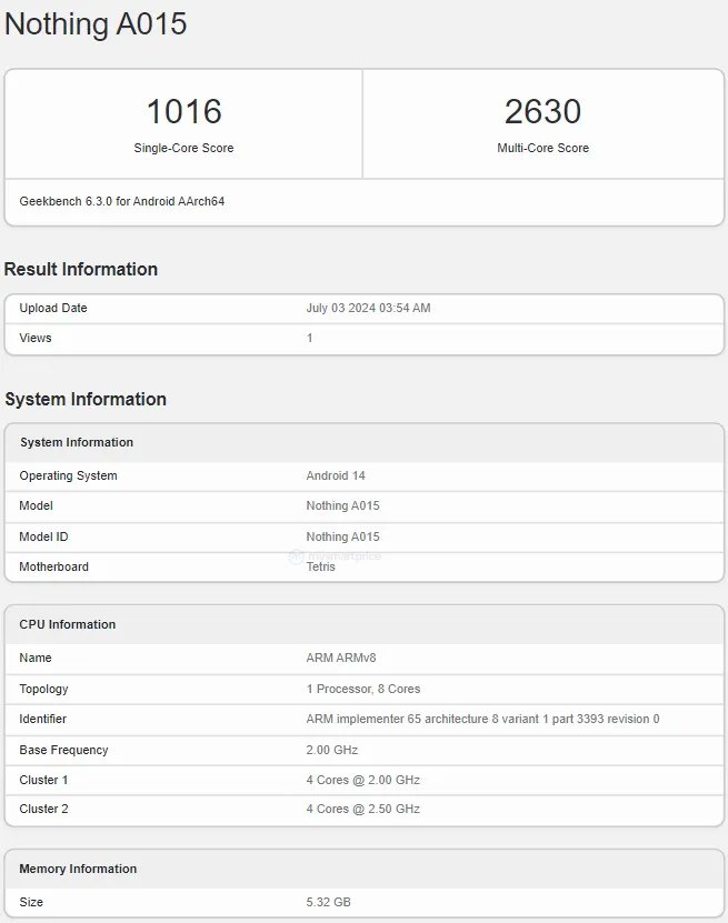 今天,CMF Phone 1 已经出现在了 Geekbench 数据库中,显示该机将搭载联发科芯片(爆料显示是天玑 7300),配备 6GB 内存,预装安卓 14 系统。