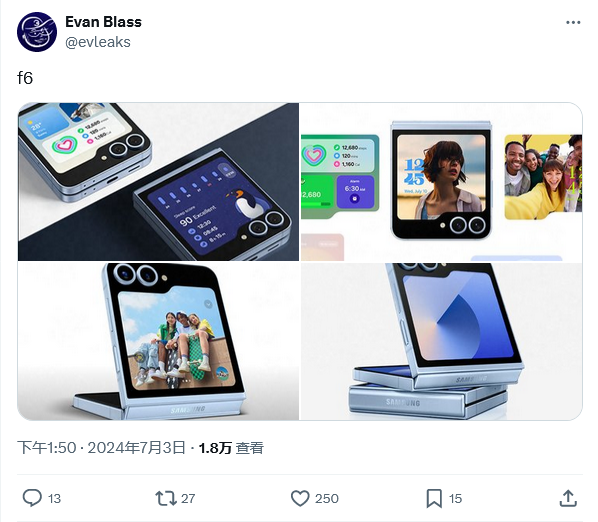 IT之家 7 月 3 日消息,消息源 Evan Blass(@evleaks)今天发布推文,分享了三星 Galaxy Z Flip6 手机的宣传图片,照片展示了蓝色版本,外屏采用“文件夹”造型,相机部分配有蓝色圆环,其余部分为黑边。