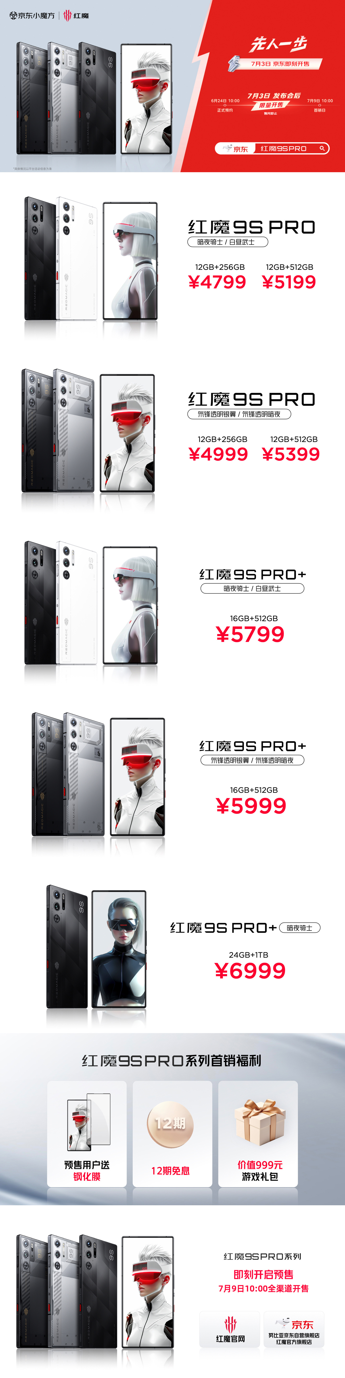 红魔 9S Pro AI 游戏手机售价 4799 元起,7 月 9 日 10:00 全渠道开售,购机享购机 12 期免息、购机赠价值 999 元游戏礼包、预售用户买赠钢化膜,IT之家附具体售价如下: