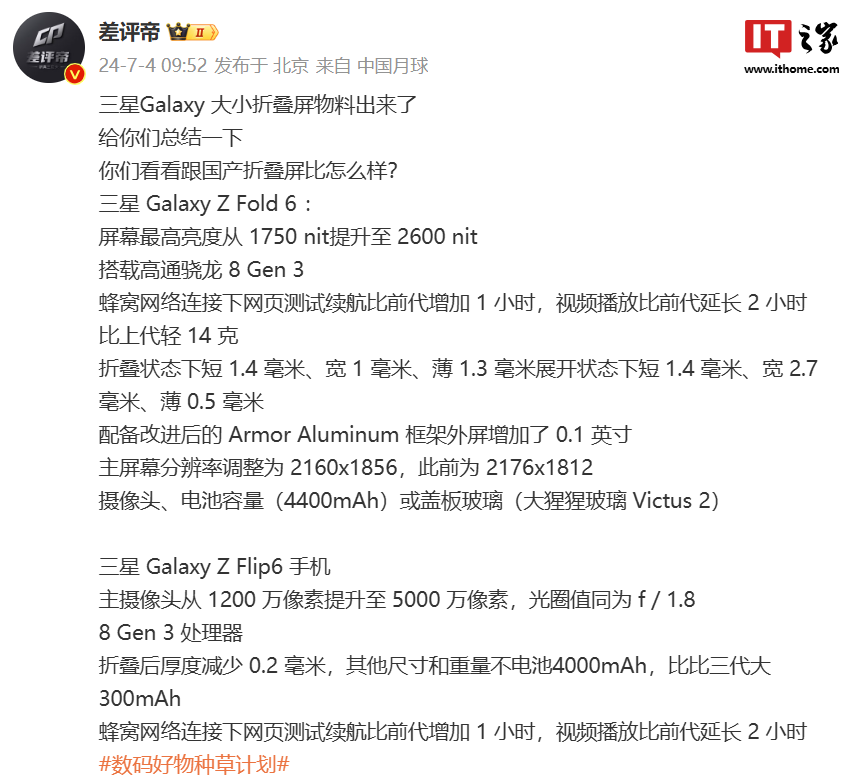 IT之家 7 月 4 日消息,博主 @差评帝 今日发文,放出了三星 Galaxy Z Fold6 和 Galaxy Z Flip6 两款折叠屏手机部分配置信息。