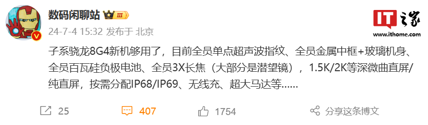 IT之家 7 月 4 日消息,博主 @数码闲聊站 今日发文,爆料了“骁龙 8 Gen4 新机”部分配置信息,根据评论区讨论来看,“子系新机”为 iQOO 13、一加 13 以及 realme 真我 GT7 Pro。
