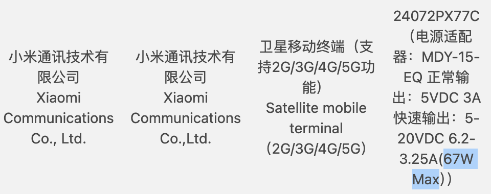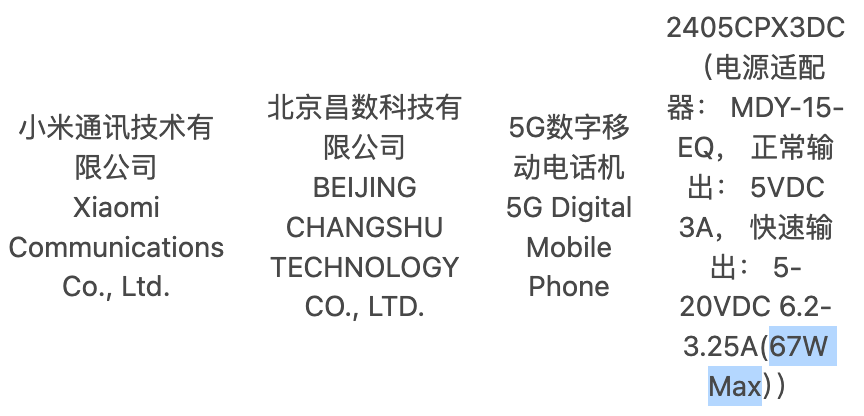 有线充电方面,3C 认证信息显示,标配适配器依旧只支持 67W 的峰值功率。
