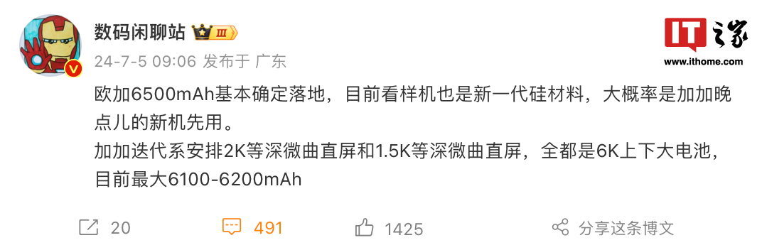 该博主同时透露了“加加迭代系”机型,由于一加 13 采用 5800 mAh 电池,因此这款“迭代系”机型有望为一加 Ace 4 / Pro,据称将可选 2K 等深微曲直屏 / 1.5K 等深微曲直屏,配备“最大 6100-6200mAh ”电池。