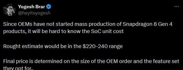 消息源 Yogesh Brar 推测第四代骁龙 8 处理器将涨价 25%-30% 至 220 – 240 美元(IT之家备注:当前约 1602 – 1748 元人民币),而第三代骁龙 8 处理器价格为 190 – 200 美元(当前约 1384 – 1457 元人民币)。