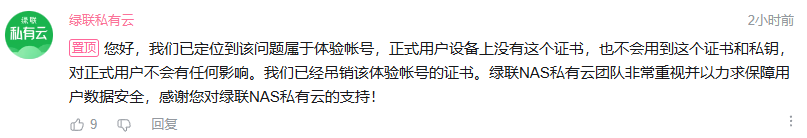 您好,我们已定位到该问题属于体验账号,正式用户设备上没有这个证书,也不会用到这个证书和私钥,对正式用户不会有任何影响。我们已经吊销该体验账号的证书。绿联 NAS 私有云团队非常重视并以力求保障用户数据安全,感谢您对绿联 NAS 私有云的支持。
