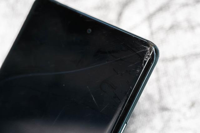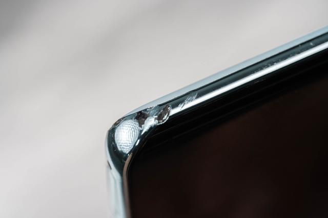 在测试中,OPPO A3 Pro 的右上角首先触地,导致屏幕破裂。在随后的滚动过程中,中框左下角也受到了严重磨损,屏幕表面出现了明显的划痕。虽然 OPPO A3 Pro 在一般的日常使用中表现良好,但在高强度跌落测试中,其曲面屏幕和中框的抗冲击能力表现不佳。