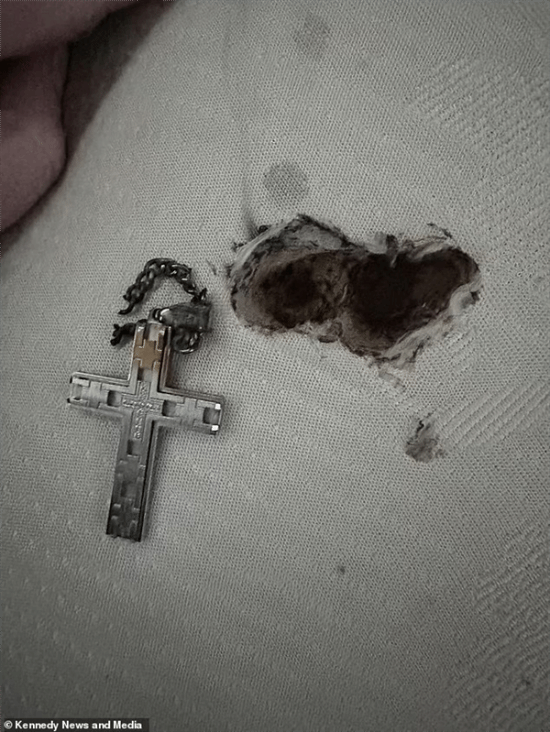 儿子的脖子和锁骨上,红红的一片,还出现了一道道触目惊心地黑色烧焦痕迹,形状就是他的十字架项链。
