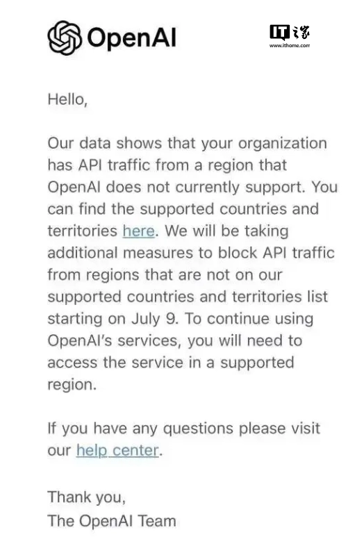 警告信中写道:“根据数据显示,你的组织有来自OpenAI目前不支持的地区的API流量。从7月9日起,我们将采取额外措施,停止来自不在OpenAI支持的国家、地区名单上的API使用。”受影响的组织如果希望继续使用OpenAI的服务,必须在其支持的国家或地区内进行访问。