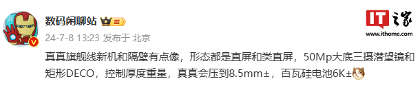 根据该博主爆料,这款新机采用直屏或类直屏设计,配备 50Mp 大底三摄潜望镜和矩形 DECO,厚度会压到 8.5mm±,这款新机还将配备 6000mAh 左右电池,支持百瓦快充。不出意外的话,骁龙 8 Gen 4 处理器也是必不可少的。
