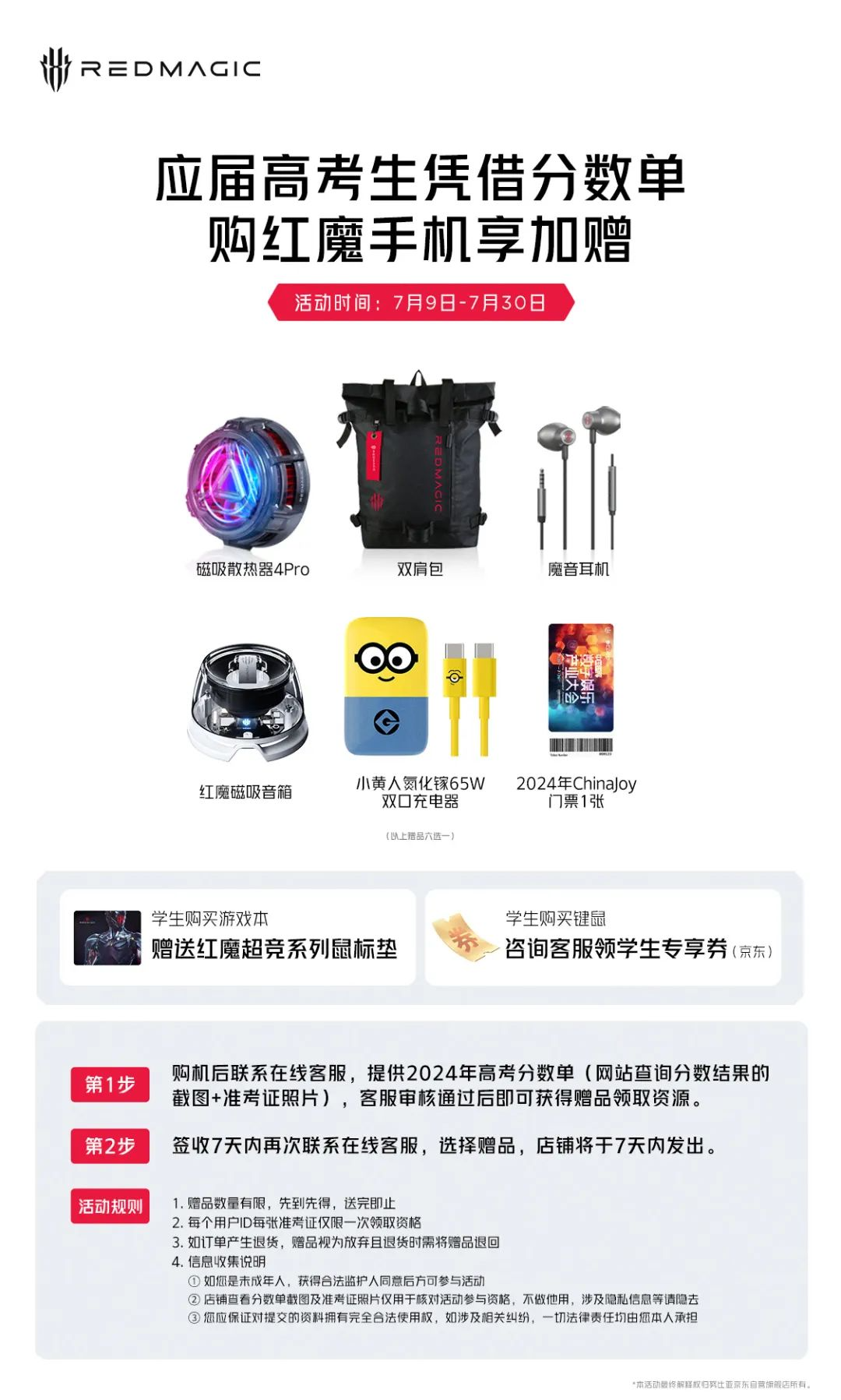 据介绍,应届高考生凭分数单(网站分数查询结果截图 + 准考证照片)购买红魔 9S Pro 系列手机时,可在“散热器、双肩包、魔音耳机、磁吸音箱、氮化镓充电器和 2024 ChinaJoy 门票”选择一款领取,IT之家附活动详情如下:
