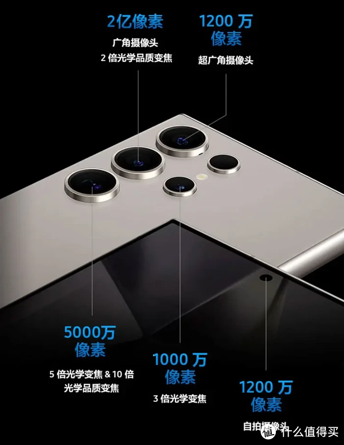 三星 Galaxy S24 Ultra的黑科技在摄像头上,配备了2亿广角+5000w长焦+1000w长焦+1200w超广角+1200w前置镜头,支持2-10倍光学变焦和100倍数码变焦,同时支持拍摄8K30帧的高规格视频,以及240帧慢动作,影像素质拉满。
