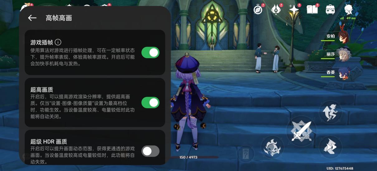 在基础游戏体验之外,真我 GT6 还支持平台级的游戏超帧体验,比如《原神》游戏,支持“游戏插帧”功能,开启后,即可实现原生的 90 帧超帧游戏体验。