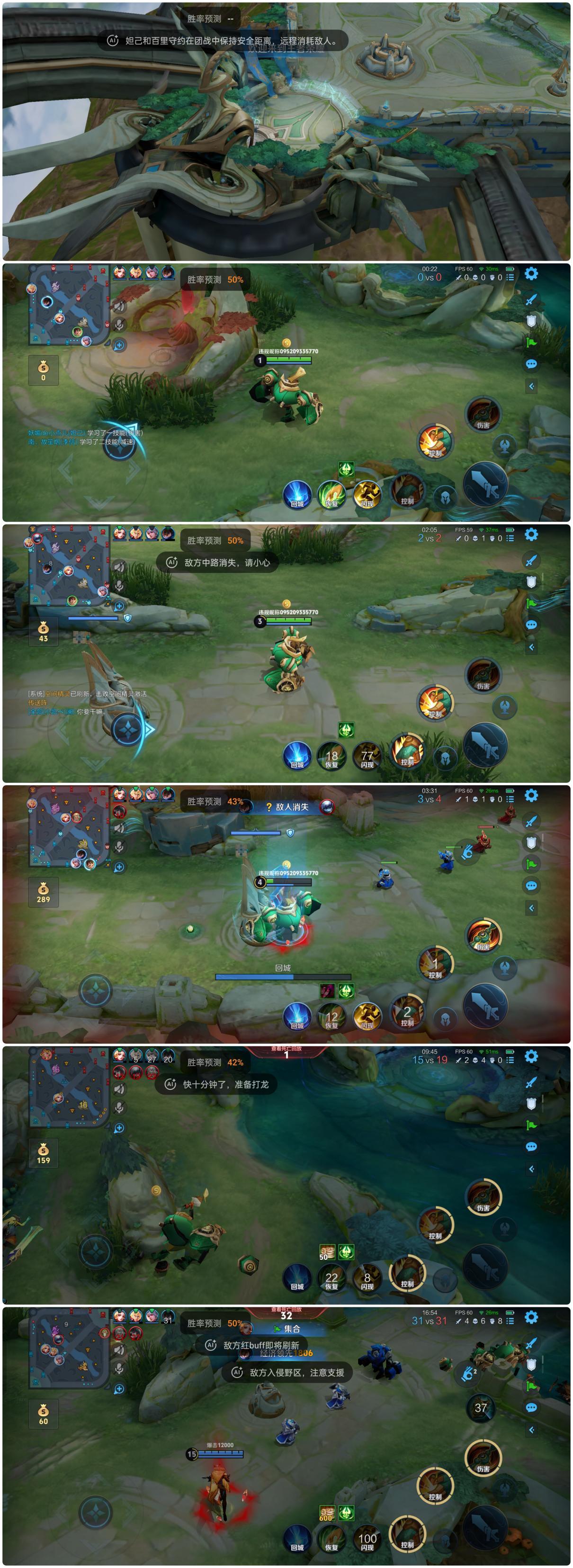 在游戏过程中,“AI 大神辅助”都能随机触发游戏提示。并且,针对特定场景,如敌方消失、团战、buff 刷新、龙坑刷新、回血制裁、推塔等,系统都会及时提醒,甚至还会告诉你接下来的对局策略,直接手把手教你怎么玩了。