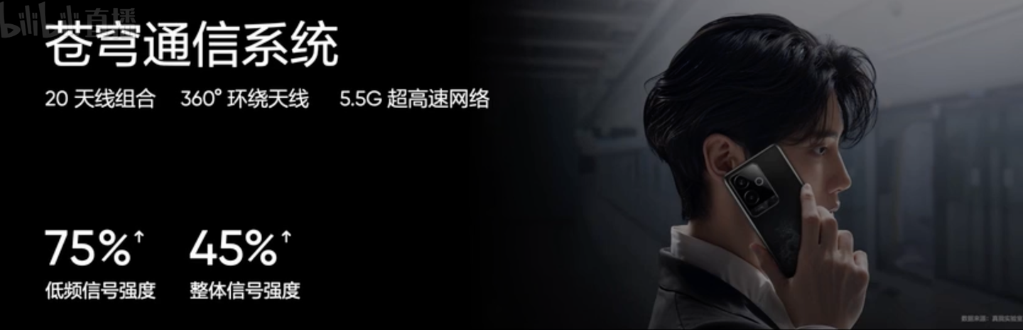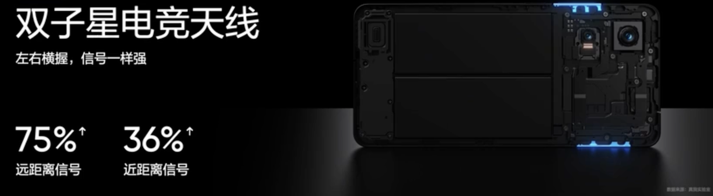 此外,该机还搭载“苍穹通信系统”采用 20 天线组合,支持 5.5G 网络,号称低频信号强度提升 75%,整体信号强度提升 45%;同时搭载双子星电竞天线,号称“左右横握信号一样强”。