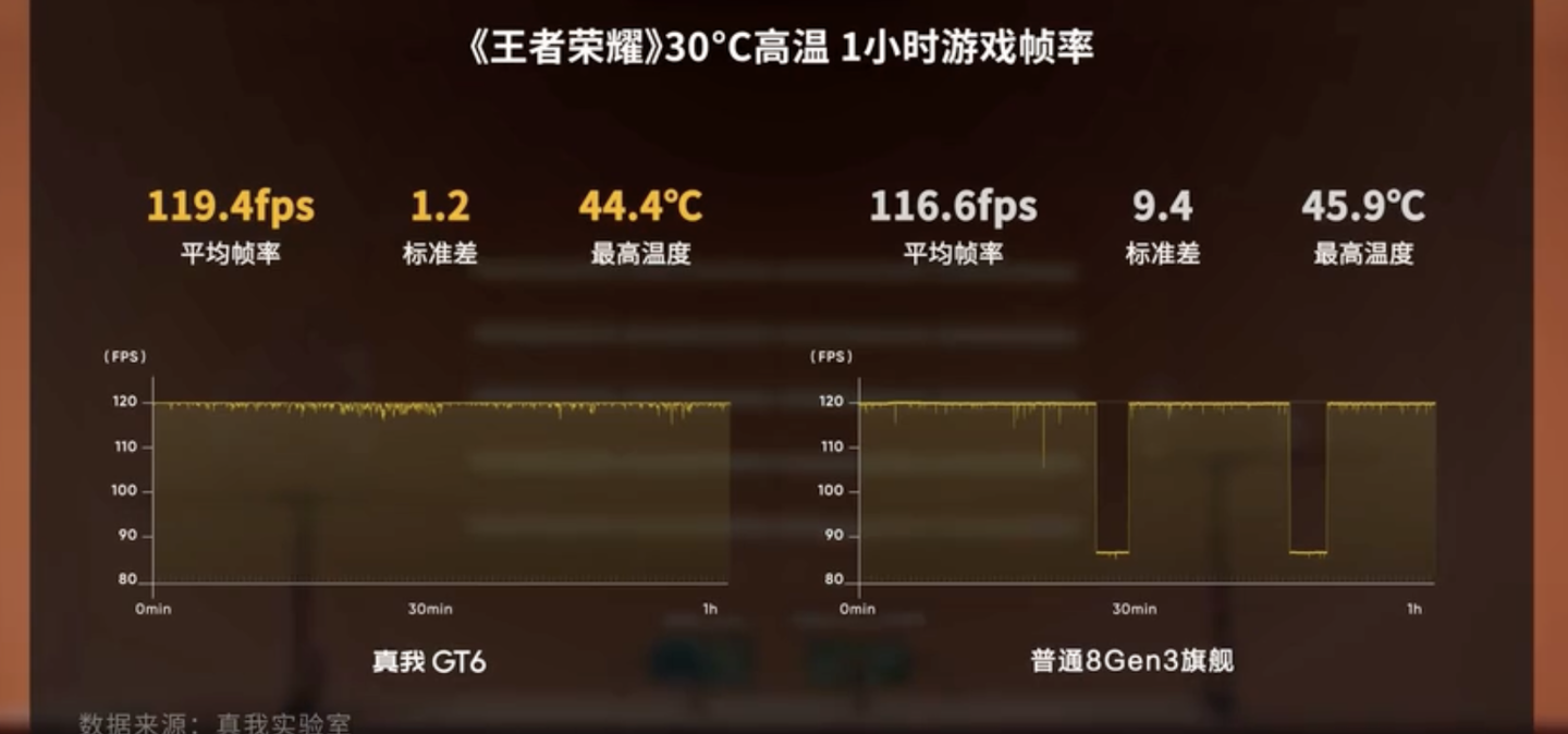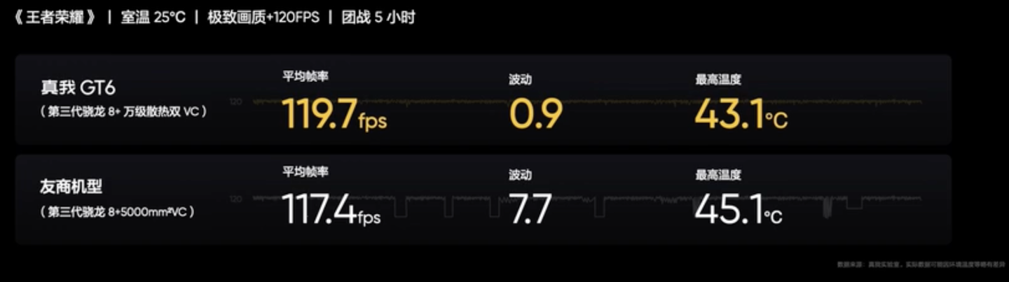 此外,realme 真我 GT6 手机搭载全新中框架构,号称能够全面优化导热链路,温升至高下降 2 度,号称“舒适不烫手”;在《王者荣耀》团战 5 小时测试场景中,平均帧率 119.7 FPS,波动率 0.9,最高温度 43.1 度。