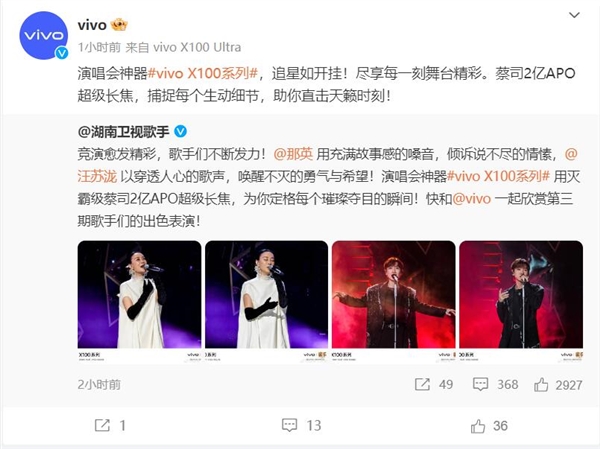 湖南卫视歌手官微表示,vivo X100 Ultra是演唱会神器,那英、汪苏泷等歌手们的精彩瞬间被灭霸级蔡司2亿APO超级长焦定格,尽享每一刻舞台精彩。