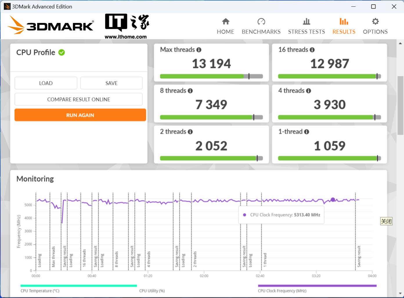 接着我们又用 3D Mark 的 CPU Profile 项目测试了一下更为详细 CPU 的多线程性能,原子侠 G7 Platinum 最终拿到了单线程 1059 分,最大线程 13194 分的成绩。