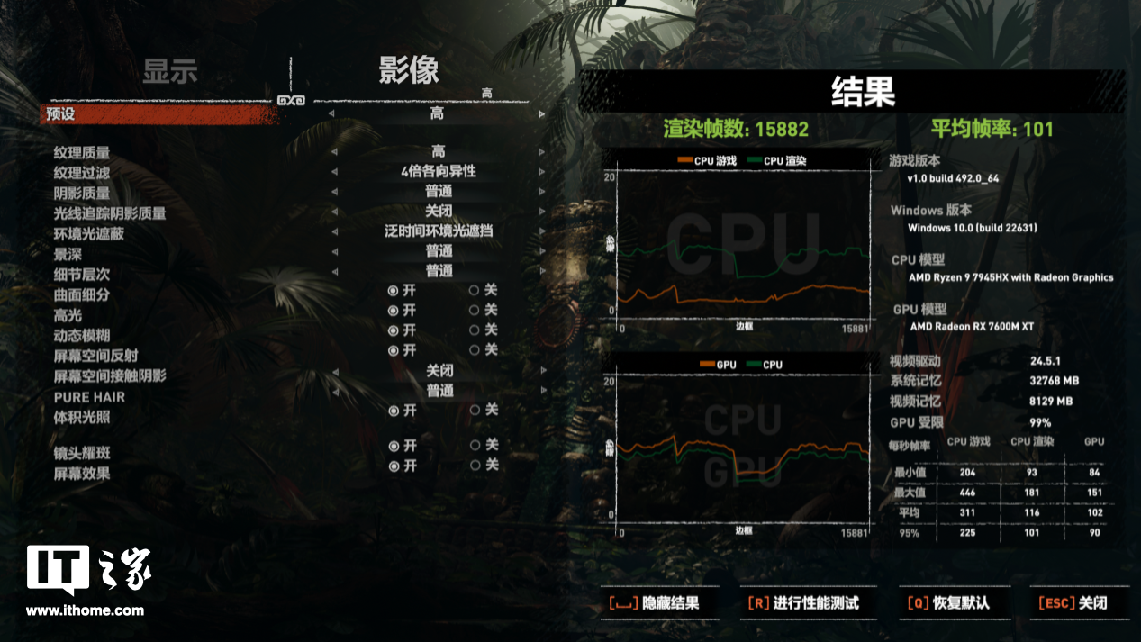 在经典光栅游戏《古墓丽影:暗影》中,先是以 2K 高画质运行其自带的基准测试,游戏平均帧率达到了 101 帧,1% Low 帧为 84 帧。