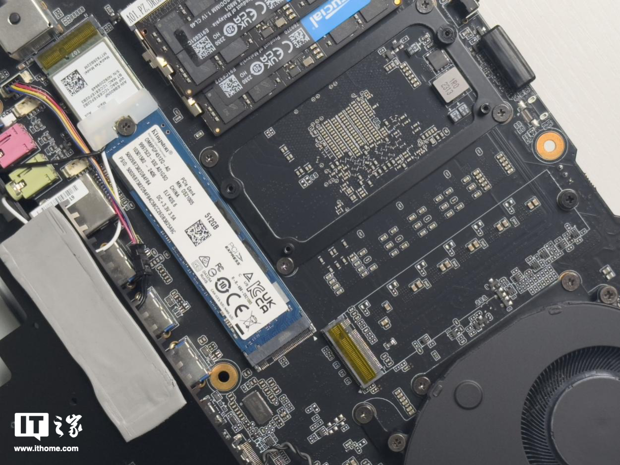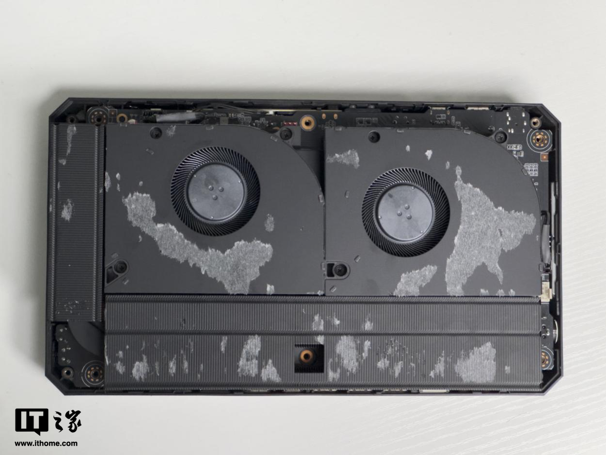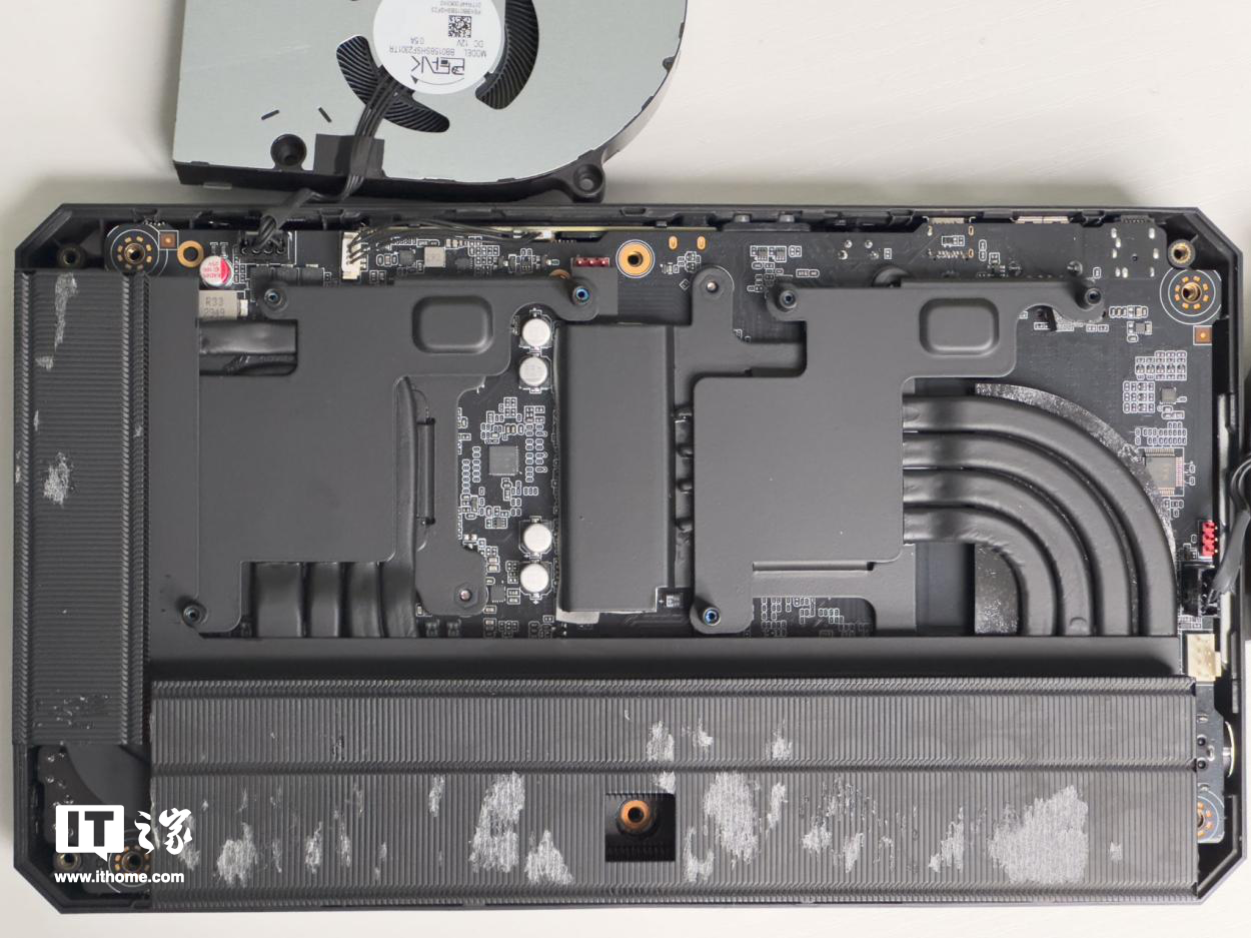 卸下 4 颗主板固定螺丝,取出主板,我们不仅能看到还有一枚风扇在辅助鳍片散热,在 SSD 区域更是有大块的散热装甲以及主动散热风扇。