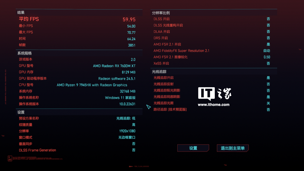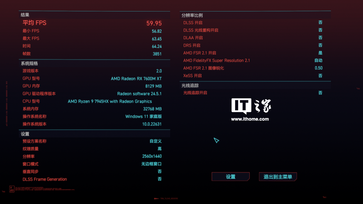 最后是压力最大的《赛博朋克:2077》,以 2K 分辨率 + 超级画质 + 开启 FSR 2.1 到自动档,关闭光追运行游戏,自带基准测试的游戏平均帧数为基本可以 60 帧畅玩。