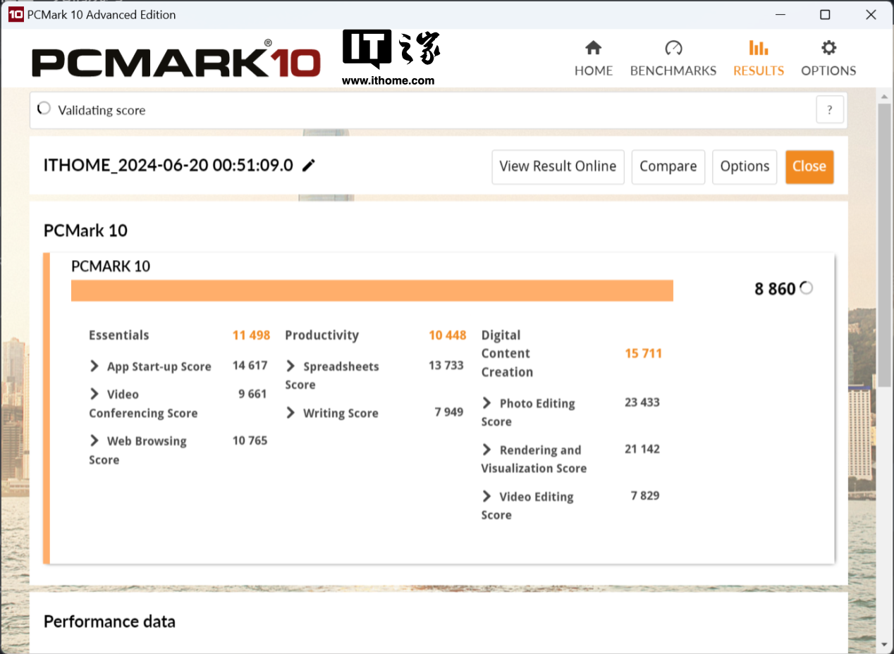 在日常办公性能上,我们通过 PC Mark 10 现代办公基准测试项目进行考察,实测其 3 个项目得分均突破 1W,综合成绩则达到了 8860 分,应付各类日常办公绰绰有余。