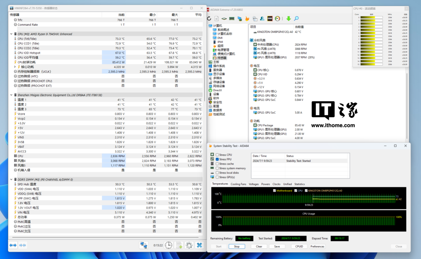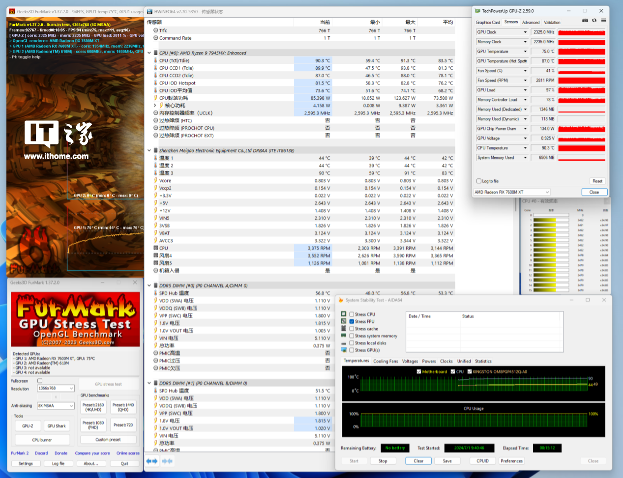 最后是 15 分钟双烤测试,CPU 一开始能跑到 124W,随后还是稳定在了 85W,此时 CPU 的核心频率为 3.5GHz,温度则是来到了 90°C。GPU 这边依旧有 120W 以上的性能释放,甚至有时能飙到 134W,GPU 频率提升至 2325MHz,GPU 温度则是 75°C。也就是说整机性能释放能达到 85W + 134W= 219W 左右。这样看原子侠 G7 Platinum 的 Cold Wave Ultra 散热系统确实很稳能,轻松压住锐龙 9 7945HX 处理器 + RX 7600M XT 独立显卡这套硬件组合,官方 205W 的性能释放还是说保守了。