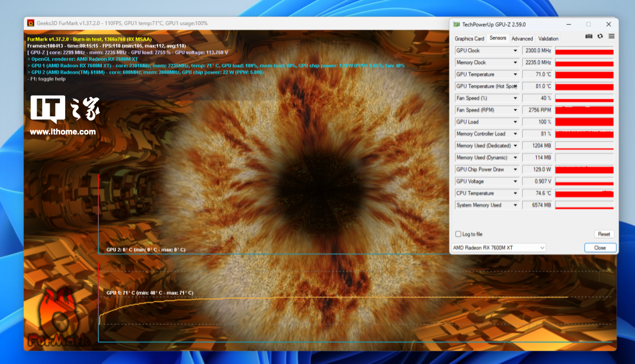 然后是 15 分钟单烤 GPU,RX 7600M XT 功耗始终保持在 120W 以上,GPU 温度则是 71°C,GPU 频率 2300MHz,可以说性能释放得很充分。