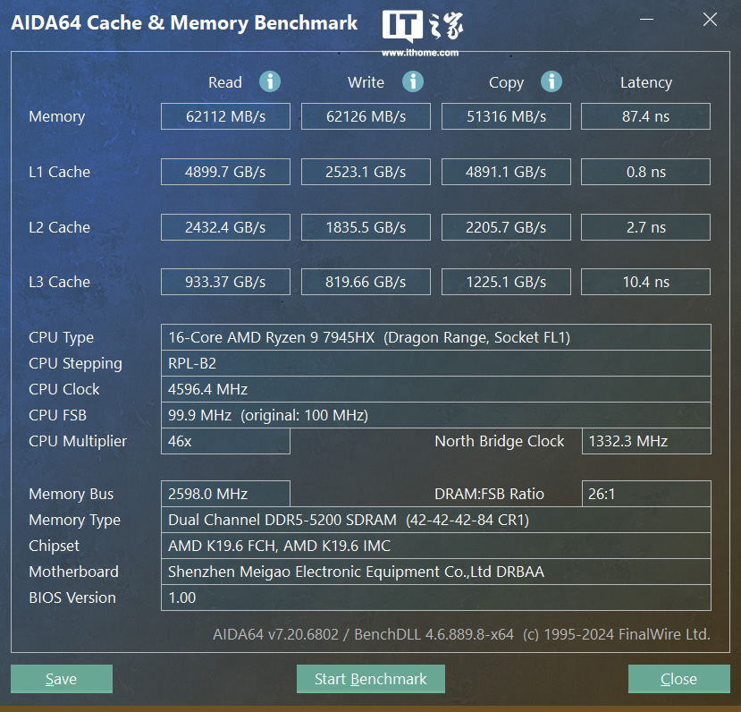 随后IT之家使用 AIDA64 对内存性能做了测试,其读写都在 62100MB/s 左右,而拷贝分数也有 51300MB/s+,内存延迟为 87.4ns,L3 缓存延迟为 10.4ns,是 5200MT/s 的正常表现。