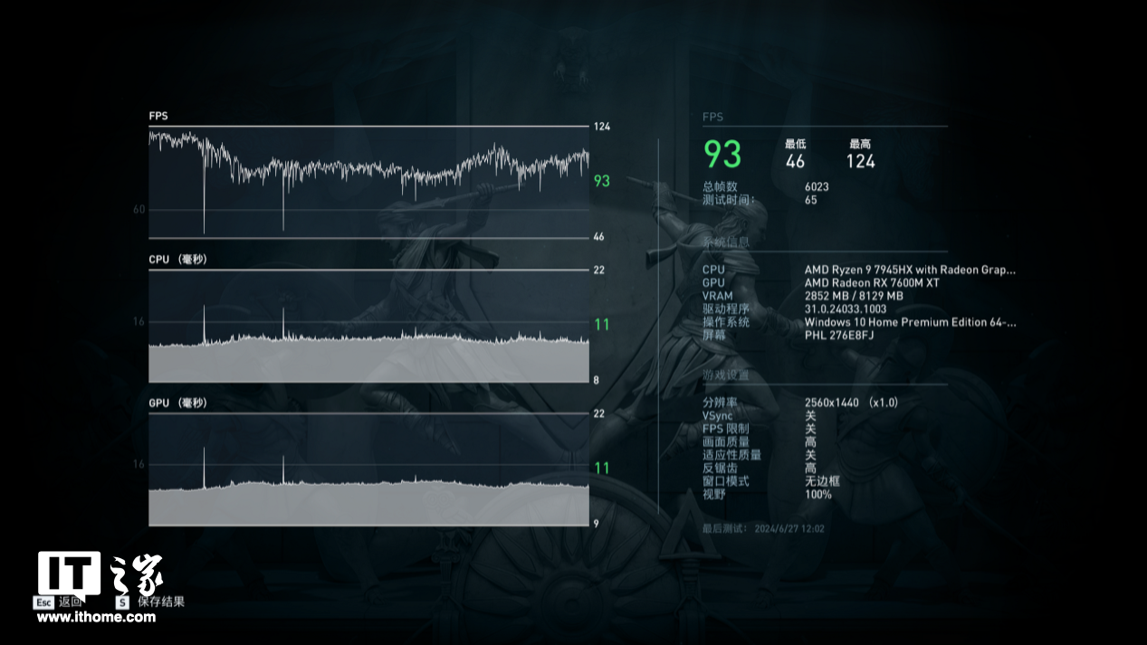 而在另一款压力更大的动作冒险游戏《刺客信条:奥德赛》中,采用 2K 分辨率 + 高画质运行,自带基准测试的平均帧数为 93 帧。