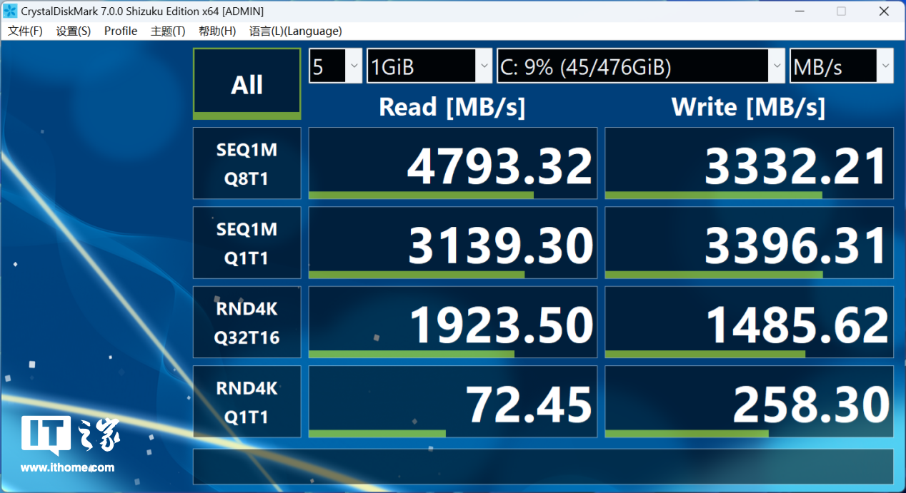 IT之家使用 CrystalDiskMark 对其硬盘性能做了测试,写入为 4700MB/s+,读取则为 3300MB/s+,符合 512GB PCIe4.0 固态硬盘的表现。