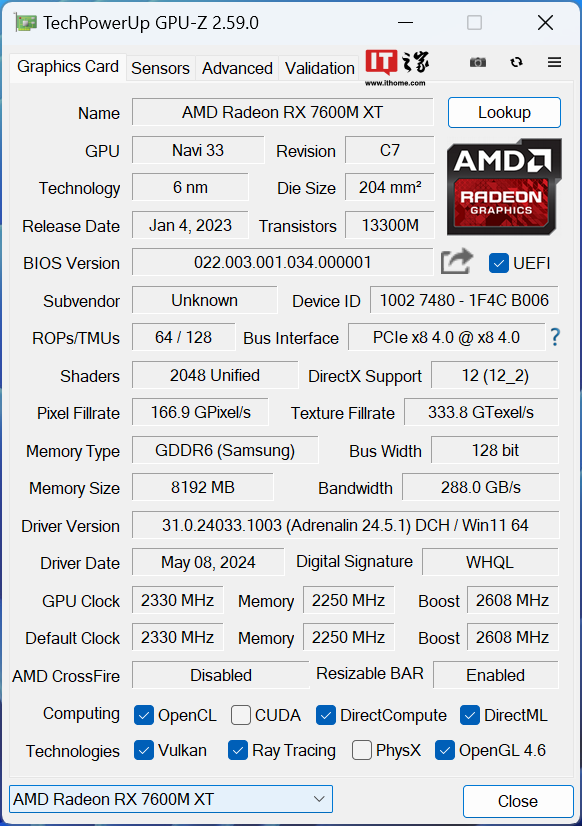 GPU 方面则是搭载 RX 7600M XT 独立显卡,这块显卡采用 AMD RDNA3 架构。拥有 32 个计算单元、64 个光栅单元、流处理器共 2048 个,核心频率 2300MHz,显存为 8GB GDDR6,显存位宽 128bit,有着 120W 的性能释放,其理论性能与英伟达的 RTX4060 旗鼓相当。