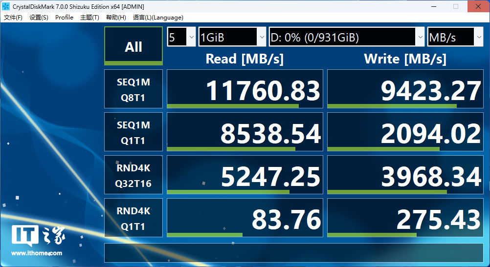 CrystalDiskMark 对这块 PCIe 5.0 的硬盘性能做了测试,写入轻松突破 11700MB/s+,读取则为 9400MB/s+,这对于游戏加载读取有着极大的优势。