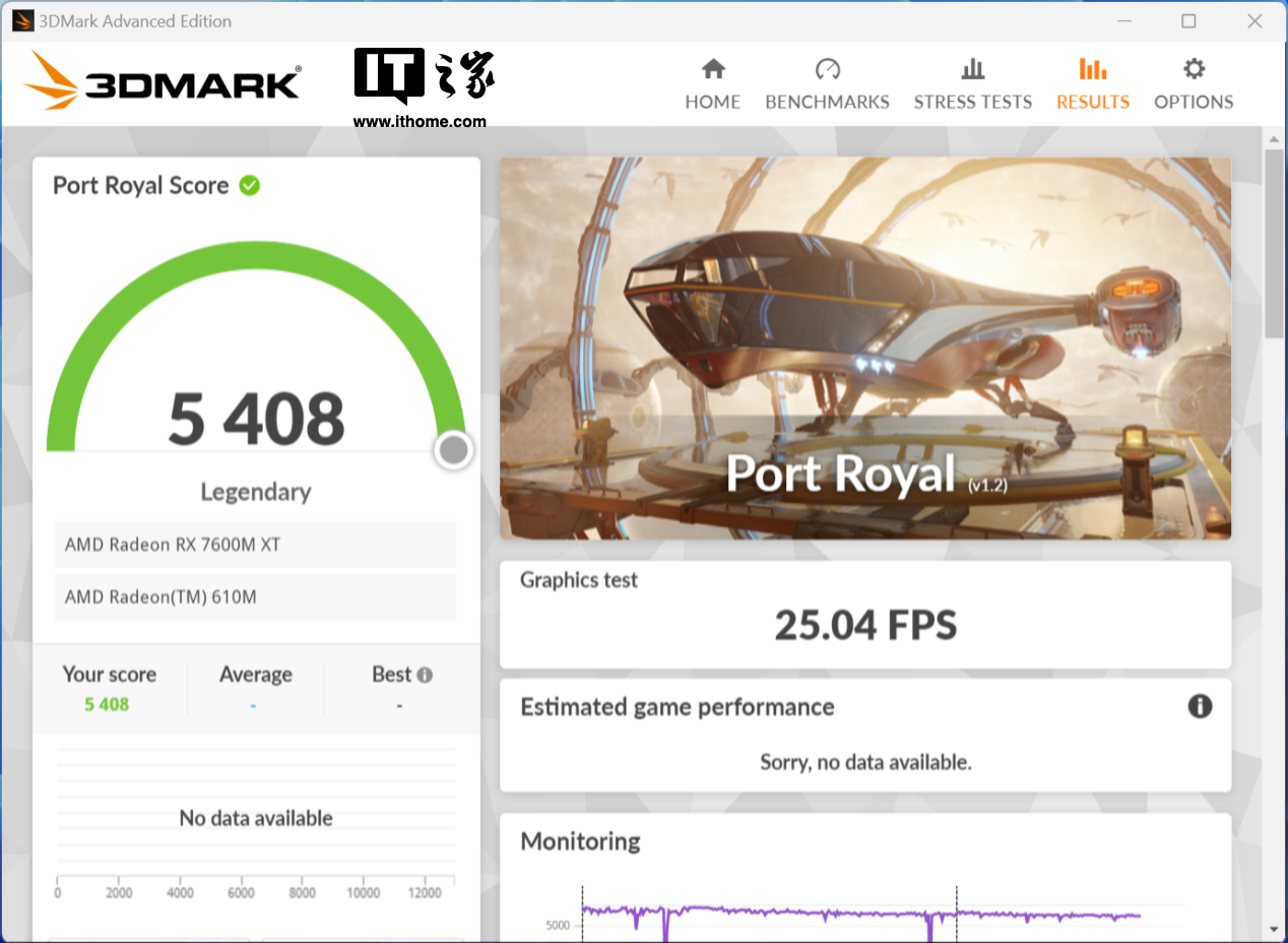 考验光追性能的 Port Royal 测试中,原子侠 G7 Platinum 的 RX 7600M XT 获得了 5408 分的成绩。