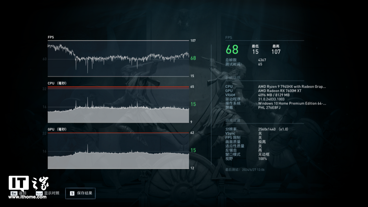 随后我们将画质提升至极高,再次运行基准测试,平均帧率仍有 68 帧,依旧可以十分流畅地游玩。