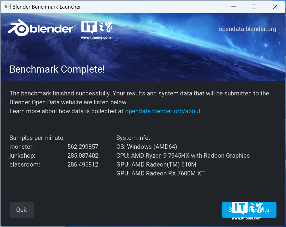 原子侠 G7 Platinum 作为一台有着 205W 以上性能释放的独显迷你主机,除了玩游戏外,它同样是一台出色的生产力工具。IT之家首先测试了 Blander Benchmark 3.0,以考察其建模性能,其中 monster 场景突破 560 分,junkshop 与 classroom 也有 280 分以上的成绩,足以应对复杂模型的绘制。