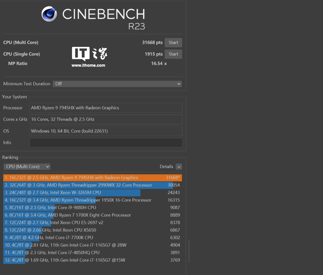 接下来就是理论性能跑分了,原子侠 G7 Platinum 在 CineBench R23 的测试中,CPU 单核分数为 1915 分,多核分数为 31668 分,符合锐龙 9 7945HX 的预期水平。