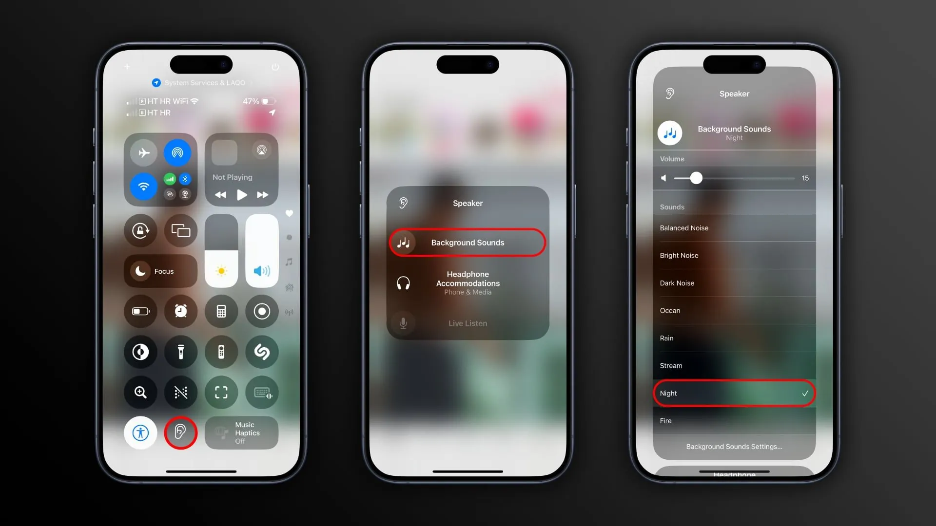 用户前往“设置” >“辅助功能”>“音频与视觉”>“背景音”,然后打开“背景音”,用户也可以点击通过轻点控制中心中的“助听设备”按钮,来快速访问“背景音”。