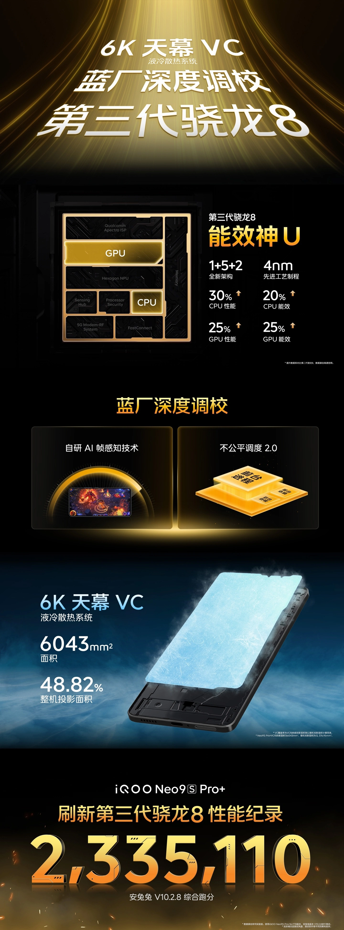 iQOO Neo9S Pro + 搭载高通第三代骁龙 8,安兔兔跑分超 233 万,采用 iQOO 自研 AI 帧率感知技术,可实时监控负载并做到精准调度分配:支持不公平调度 2.0,优化重载场景下性能资源分配,保障游戏流畅运行;内置 6K 天幕 VC,占整机投影面积将近一半,几乎覆盖机身的每个核心热源。