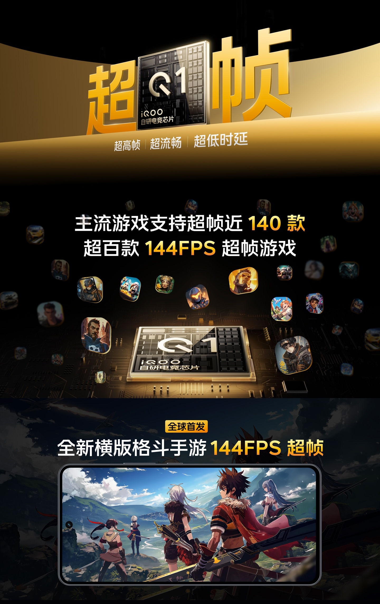 iQOO Neo9S Pro + 搭载自研电竞芯片 Q1,支持 PC 级超分,近 140 款游戏支持超帧,其中 144FPS 超帧游戏超过百款;全球首发全新横版格斗手游 144FPS 超帧。