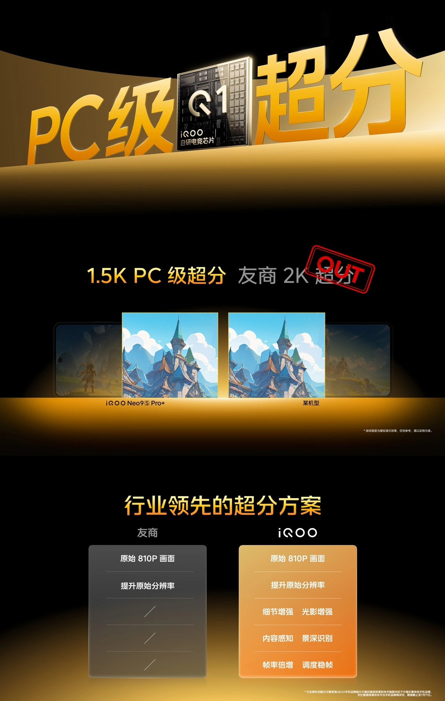 官方称,iQOO Neo9S Pro + 支持 1.5K PC 级超分,有媲美 PC 端游戏的清晰度。得益于自研电竞芯片 Q1 在内容感知、景深识别、细节增强、光影增强等方面的领先能力,让 iQOO 的超分超越原生画质、比肩 PC 视效。
