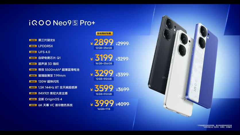 iQOO Neo9S Pro + 暑促特惠首销限时立减 100 元,2899 元起。即日起线上线下同步开启预售,7 月 16 日 10:00 正式于各大平台开售。IT之家附各机型具体限时售价如下: