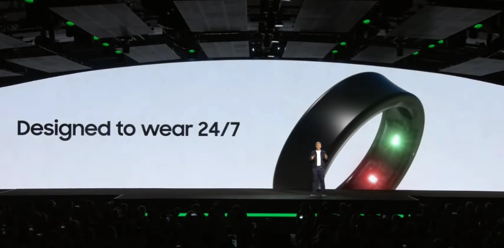 首先是让大家眼前一亮的 Galaxy Ring ,简单来讲,这其实是一个健康穿戴设备,内置了各种传感器,支持心率、血压等检测功能,可以实现类似智能手表的那些功能。