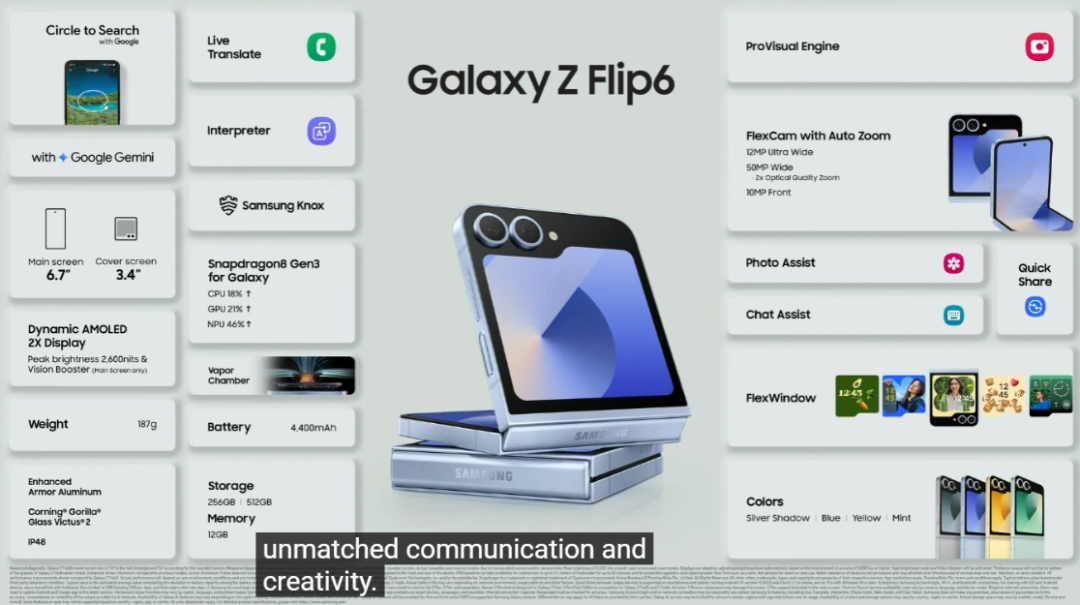 至于小折叠屏 Z Flip6 嘛,几乎就是上一代炒冷饭,用上了新的芯片,电池容量从 3700 增加到了 4000 ,续航会更长。